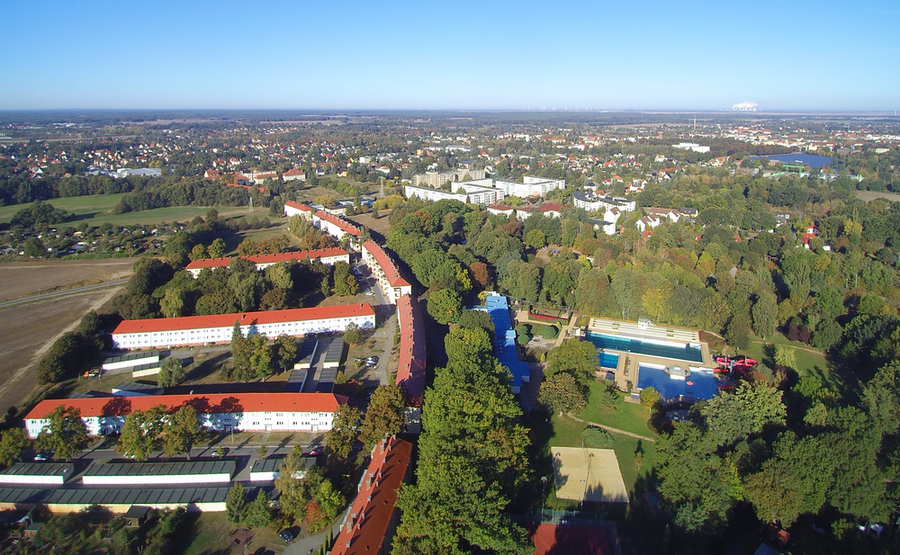 Ostdeutscher Rosengarten Spuren im Kornfeld Kreishaus Brandenburgisches Textilmuseum Reisigwehrinsel und Teil der Wehrinsel Erntezeit Kaskadenbrunnen im Rosengarten